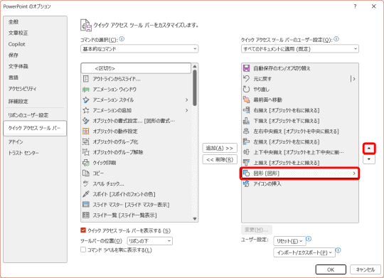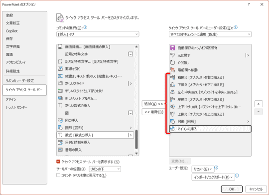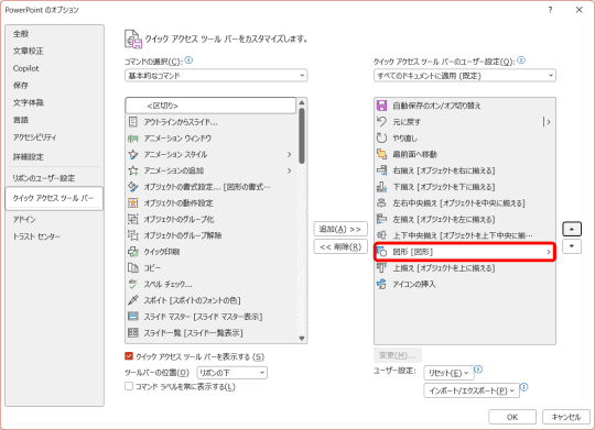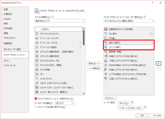 今度は、よく使う機能をクイックアクセスツールバーに登録していきましょう。[PowerPointのオプション]画面から追加します。なお、機能の順番は入れ替え可能なので(後述)、よく使う機能をどんどん追加していきます。タブに表示されていない機能を選択することも可能です。