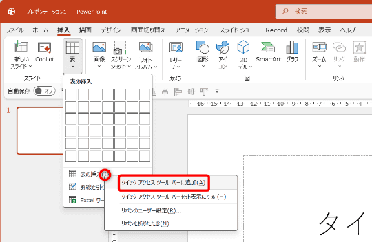 [PowerPointのオプション]画面で必要な機能を探しきれない場合は、リボンにあるボタンを右クリックしてクイックアクセスツールバーに追加することもできます。