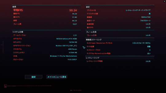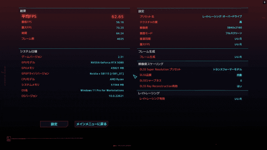 試してみたのは、ハイエンドなゲームグラフィックスのテストとして長く使われている「サイバーパンク2077」。ゲーム内にベンチマークプログラムが用意されている上、結果で一部のスペックが表示される。