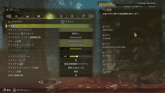 5080リグ対応の「モンスターハンターワイルズ」を起動してみると、解像度4Kで最高画質にし、DLSSなども可能な限りVRAMを食うように設定しても、ゲーム内で確認できるVRAM使用量は約14GBが限界。現状ではどのゲームでも想定されていないほど大容量のVRAMなので、安心して高画質設定を選べる。