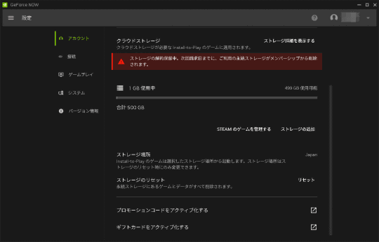 PerformanceおよびUltimateのユーザーには、標準で100GBのオンラインストレージが提供される。ただしこのストレージは「シングルセッションクラウドストレージ」とされている。「GeForce NOW」に接続してSteamからゲームをインストールできるが、接続を切るとストレージの内容は消去され、次回プレイする際には再びインストール作業から行う必要がある。