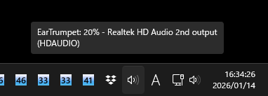 インストールすると、タスクトレイにWindows標準のサウンドアイコンとそっくりのアイコンが表示される。似すぎていて一見どっちがどっちかわからないが、Windows 11ではサウンドやネットワークのアイコンが一体化しているので、単体のスピーカーアイコンが本ソフトのもの、と見分けられる。