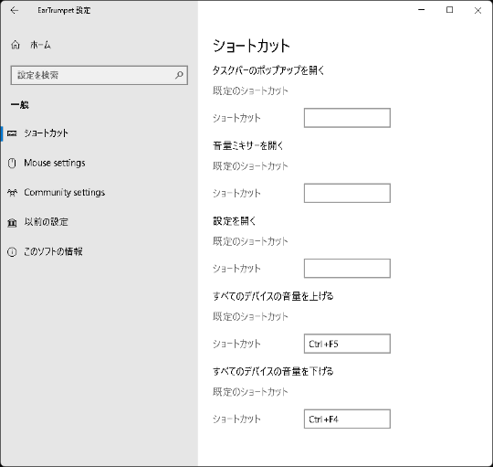 設定では、全てのデバイスの音量調整などをショートカットキーに設定する機能もある。ノートPCだと[Fn]キーとの組み合わせで標準搭載されているものが多いが、これを使えばデスクトップPCでも簡単に設定できる。