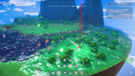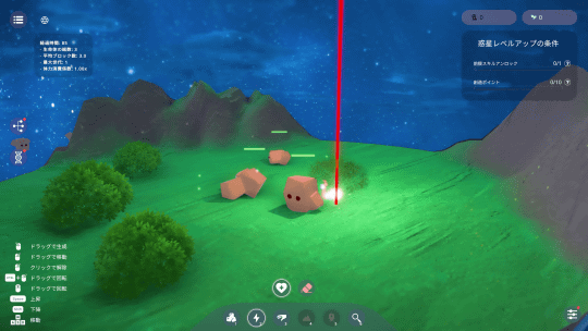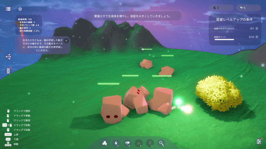 最初はかなり狭い球体内の世界だが、ポイントでより広い世界に拡張していける。また地形を修正したり、生物のブロックのタイプを変更できたりもする。最初は四角いブロックだけで構成されていたものが、丸いブロックを使えたり、バネのような関節を持たせたりと、モデルの自由度が上がっていく。