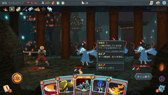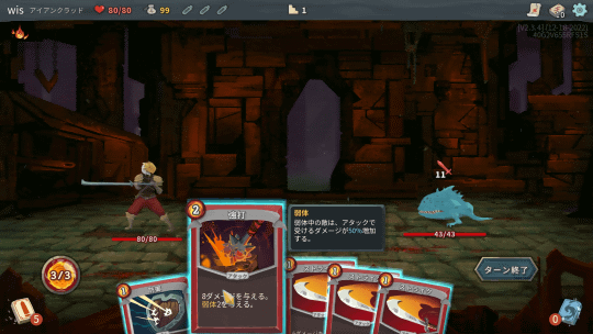 エナジーやカードを使いきったら、敵のターンになる。敵にはカードの概念はないが、行動パターンがさまざまあり、攻撃だけでなく状態異常なども繰り出してくる。ただ攻撃してくるだけの敵もいれば、ターンごとに攻撃力が上がる特性を持ったものや、攻撃を無効化するものなどさまざまなタイプがいる。
