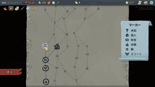 フィールドは単純化されたマップで表示され、敵との戦闘やアイテム収集、取引可能な商人、ボス部屋などが書かれている。基本的にマップの下から上へと進んでいくが、途中でルートが分岐していることがあり、好きに選んで進める。このマップは毎回自動生成されるそうで、そこはローグライクの1要素とは言える。