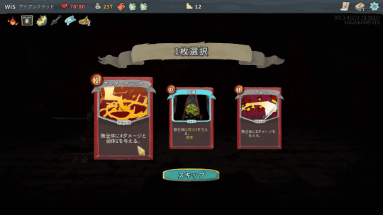 しかし次のプレイでは、それらもきれいさっぱりなくなって、最初からやり直しだ。何とも無慈悲だが、それもやっぱりローグライクなのだ。作者が言う、カードゲームとローグライクの融合という本作の方向性は、プレイしてみて正しく伝わった。