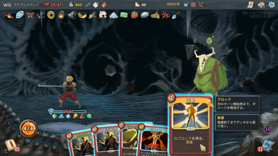 デッキ構築型カードゲームと言われると、カードを集めて自分の好きなデッキを組んでいくものをイメージする。だが本作はちょっと違う。ゲームスタート時のカードは能力の低いカードばかりで、敵を倒したりした後に報酬としてカードがもらえる。そこで強力なカードを集めて、デッキを強化していく。