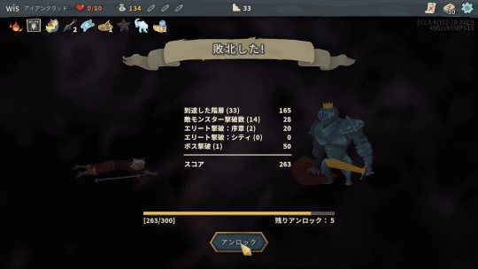 そういうゲームは、繰り返しプレイすることで能力が強化されていくものが多いが、本作はそういったものはないようだ。プレイ結果に応じて新しいキャラクターがアンロックされたりはするが、強化という感じではない。見つけたアイテムも実績として登録はされるが、いっぱい見つけたら強くなるというわけでもない。プレイする時は毎回最初からだ。これも確かにローグライクである。