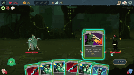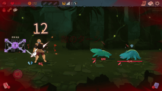 バトルに入ると、山札から引かれた5枚のカードを使って、ターンごとに3エナジーを使って攻撃や防御を行う。最初に登場する敵は、HPが43、1ターン目の行動はダメージ12。こちらのカードは1エナジーで6ダメージの「ストライク」と、5ブロックの「防御」が中心なので、全て攻撃しても全然倒せない。逆に完全に防御しきるだけで終わってしまうし、そもそもカードの引き次第では防御もしきれない。