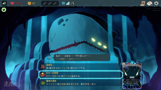 その後も地道に進んで6戦目、強力なエリートモンスターが登場した。HPが94と高い上、1ターンごとに筋力が1上がるという特殊能力持ちだ。なるべく早く仕留めたいが、最初から攻撃力が高いので防御も捨てられない。毎回20ダメージくらいの攻撃を仕掛けられ、ギリギリでいなしつつ、残りHP2で勝利した。常時強化要素となるレリックも1つ入手した。