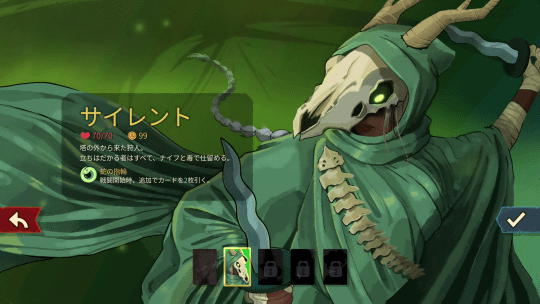 「サイレント」はナイフと毒で戦うキャラクターで、戦闘開始時に追加で2枚のカードを引ける(つまり最初から7枚引ける)。引きの当たり外れを減らせるとともに、デッキの回転が良くなるので、そこを意識したカード選びが重要になる。