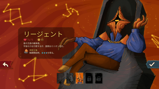 次のキャラクター「リージェント」は、戦闘開始時に星の力を3つ得る。他のキャラクターにはない独自のステータスで、エナジーのほかに星の力を消費して発動できるカードが存在する。