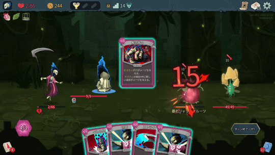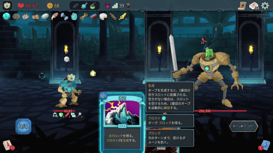 その後、最初に出会ったモンスターが同時に2体登場。多少はデッキも強化されていたが、HP残り8では攻撃をいなしきれず、あっさり撃破されてしまった。前作よりも自分と敵の行動パターンが広がったことで、デッキの方向性を見定めないとシナジーを得られにくく、1層目のクリアすらおぼつかない。