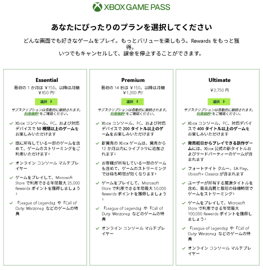 そして「Xbox Game Pass」。既に述べたとおり、ゲームの定額利用サービスである。「Essential」、「Premium」、「Ultimate」、「PC Game Pass」と4つのコースがあり、高価なプランほど遊べるゲーム作品の数が増える。