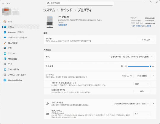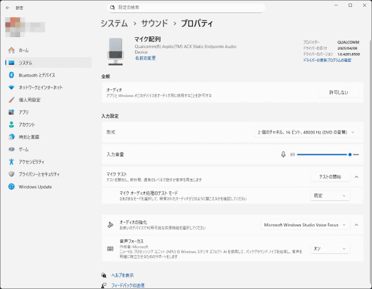 手動で探すには、設定から[システム]-[サウンド]と移動し、[入力]の項目にある[マイク配列]の中から使用中のものを探して、その項目をクリック。するとプロパティに移り、下の方に[音声フォーカス]の項目が見つかるはずだ。