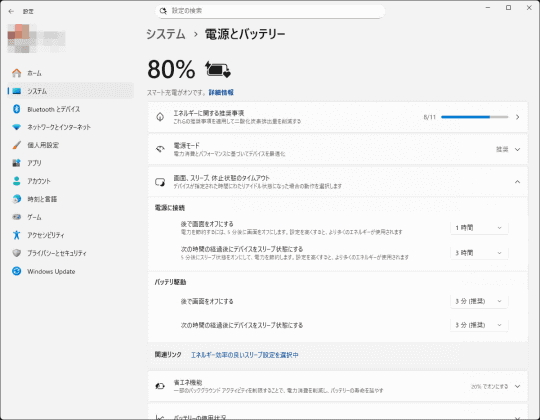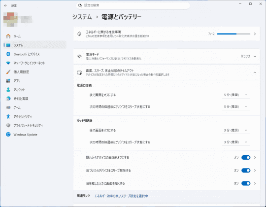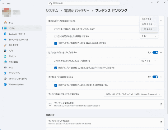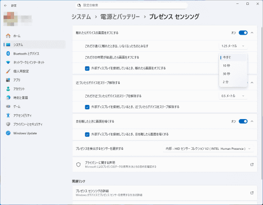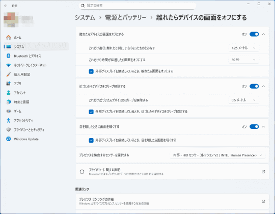 続いて[システム]-[電源とバッテリー]から、[画面、スリープ、休止状態のタイムアウト]の項目を開く。さらに[離れたらデバイスの画面をオフにする]の項目を開くと、[プレゼンス センシング]の詳細設定にアクセスできる。