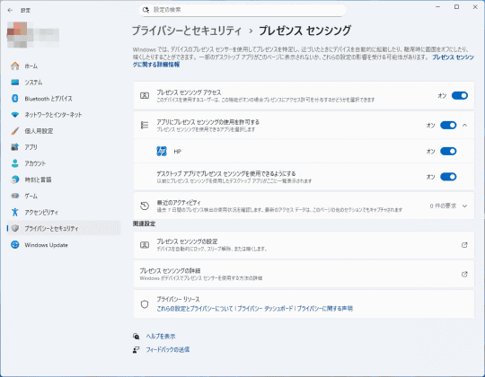 本機能を使うには、Windowsの設定から[プライバシーとセキュリティ]-[プレゼンス センシング]と進み、[プレゼンス センシング アクセス]と[アプリにプレゼンス センシングの使用を許可する]の2つをONにする。