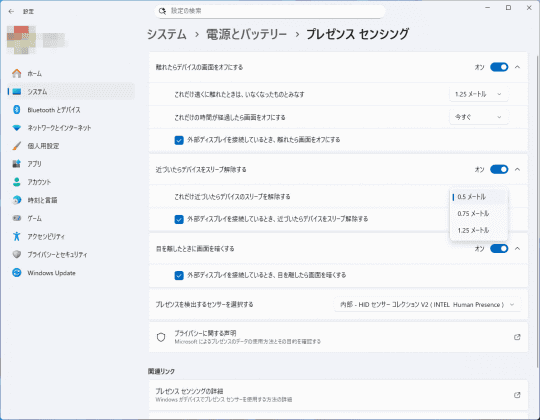 続いて[近づいたらデバイスをスリープ解除する]の設定。離席した際に自動で消えた画面を、席に戻るだけで自動で復帰させるための設定となる。ユーザーが設定した距離までPCに近づくと、PCが認識してスリープを解除する。距離は0.5m、0.75m、1.25mから選べる。