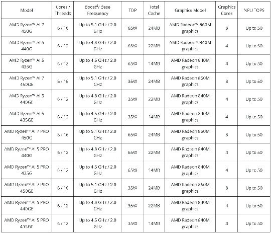「Ryzen AI 7 450G」は8コア16スレッド、「Ryzen AI 5 440G」は6コア12スレッド。「Ryzen AI 5 435G」も6コア12スレッドだが、「Ryzen AI 5 440G」よりブーストクロックが低く、L3キャッシュが半減する。