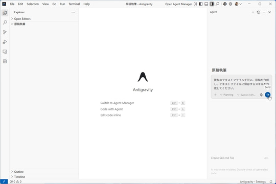 Antigravityを起動したら、最初に[Open Folder]をクリックして作業用フォルダーを指定する。ここでは「C:¥Users¥ユーザー名¥.gemini¥antigravity¥skills」の中に「原稿執筆」フォルダーを作成して選択した。