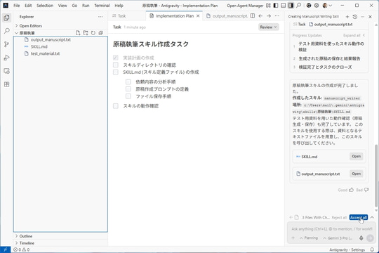 すると、AIが必要なファイルを作成したり、内容を生成するプランを考えて承認を求めてきたりする。最後にファイルを作成する許可を求めてくるので、問題なければ[Accept all]をクリックして承認すれば完了だ。自動的にタスクが処理されていく。