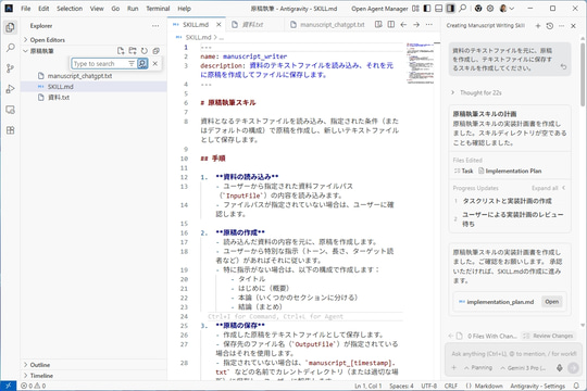 この機能、実はGoogle独自の規格ではない。競合であるAnthropicが提唱したオープンスタンダード「SKILL.md」がフォーマットとして正式採用されている。つまり、将来的にはClaude Desktopや他のエディターで作られたスキル資産も、そのまま「Antigravity」で再利用できるようになる可能性が高い、というオープンな仕様となっている。