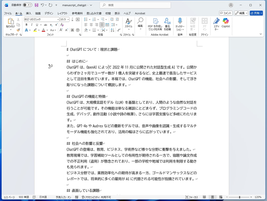 少し待つと「原稿の作成が完了しました」と表示される。設定によってはOSの通知も出る。同じフォルダーに生成された「manuscript_chatgpt.txt」を開いてみると、見事にChatGPTの解説原稿が生成されていた。