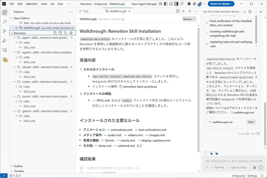特にいま話題になっているのが、動画制作フレームワーク「Remotion」との連携だ。本来、動画制作には専門的なソフトの操作やコードの知識が必要だが、RemotionのスキルをAIに持たせれば、言葉で指示するだけで、アニメーションの作成からレンダリングまでをAIが勝手に終わらせてくれる。ここでは、試しに前編で使ったエージェントツールの「Google Antigravity」に導入してみよう。