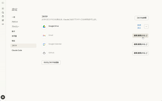 Claudeの[+]メニューから[コネクタ]-[コネクタを管理]をクリック。標準で用意されているGmailやGoogle カレンダーを連携させよう。もちろん、これもMCPサーバーだ。ここでは、Gmailアカウントを紐づけてみた。