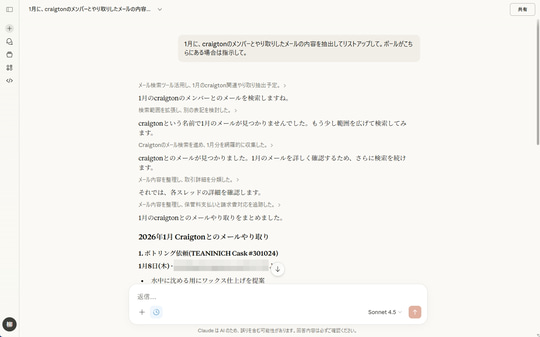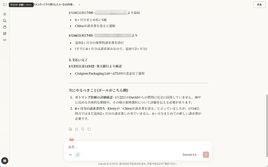 しかし、MCPで連携しているClaudeには「1月に、○○社のメンバーとやり取りしたメールの内容を抽出してリストアップして。ボールがこちらにある場合は指示して」と入力するだけ。特に何の操作も不要で、自分で考えてGmailにアクセスし、関連情報をすべて抽出してくれた。こちらからの返信も確認し、ボールがどちら側にあるか(返信する必要があるのかどうか)をジャッジしてくれた。この会社に海外送金したメールも抽出し、リストアップしてくれたのには驚いた。
