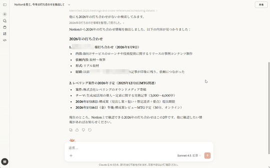 これで準備完了。「Notionを見て、今年の打ち合わせを抽出して」と入力してみる。筆者のNotionには大量のノートがあり、その中に「打ち合わせ」というノートがある。しかし、あえて何も指定せずに指示してみた。