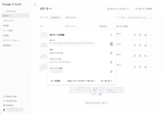 まずは「Google AI Studio」にアクセスし、Google アカウントでログインする。ダッシュボードの[APIキー]を開いて[APIキーを作成]ボタンから、新しいキーを発行する。