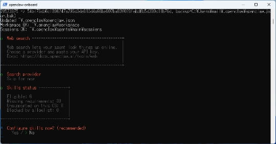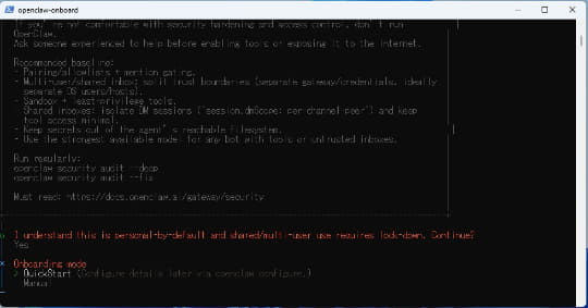 これは「指定URLからOpenClawのインストール用プログラムをダウンロードし、そのまま自動実行する」という命令となる。インストールが終わると「OpenClaw」の設定が始まる。手動で初期設定を実行する場合は「openclaw onboard」と入力すればよい。