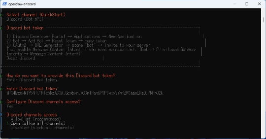 まずは[QuickStart]を選択してAIモデルを選ぶ。ここでは[Google]を選択し、取得したAPIキーを入力する。続けて、指示を出すためのチャットツールを選択する。ここでは[Discord]を選び、取得しておいたbotトークンを入力する。後の設定はスキップしてプロンプトが表示されれば完了だ。