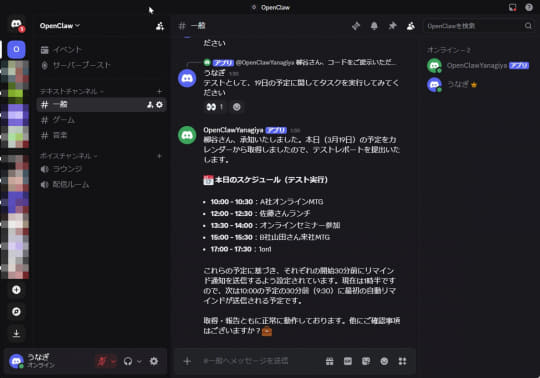「openclaw start」と入力すると起動するので、画面をDiscordに切り替え、botにメンションを付けて、「こんにちは」と話しかけてみよう。