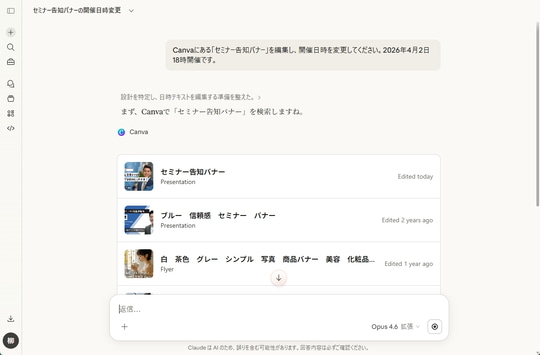 一例を挙げると、「Canvaで先月作ったキャンペーン用の画像を探して」と頼む場合、従来のMCPであれば、返ってくるのはファイル名やURLがずらりと並んだテキストの一覧だった。どれが目当てのデザインなのか、いちいちリンクを開いて中身を確認しなければならない。しかし、MCP Apps対応のクライアントでは、チャット画面の中にサムネイル画像付きのカード一覧がそのまま表示される。目で見て選び、クリックひとつで編集やエクスポートの操作に進めるのだ。