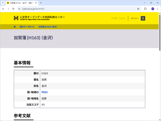 次は一つページを戻って(幕末期近世村領域データセット)、加賀藩の「藩ID」である「H163」のリンクをクリックしてみましょう。