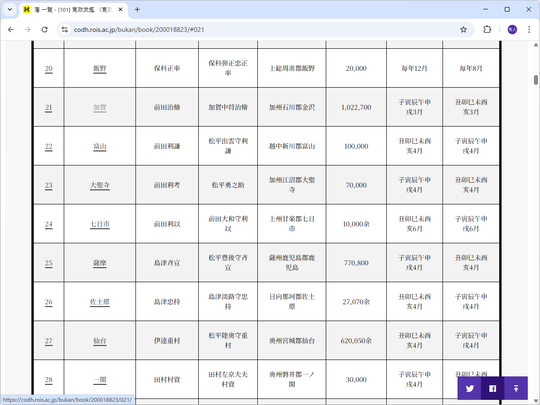 原本は「21」という加賀藩のIDをクリックすれば閲覧可能。「加賀」のリンクをクリックすれば、もう少し整理された情報にアクセスできます。殿様の名前や居城地、石高、参勤交代の日時、江戸屋敷の場所などはもちろん、大名行列に用いる道具や定紋なんかも記載されているのは面白いですね。みんな武鑑を片手に大名行列を見物していたのでしょうか。
