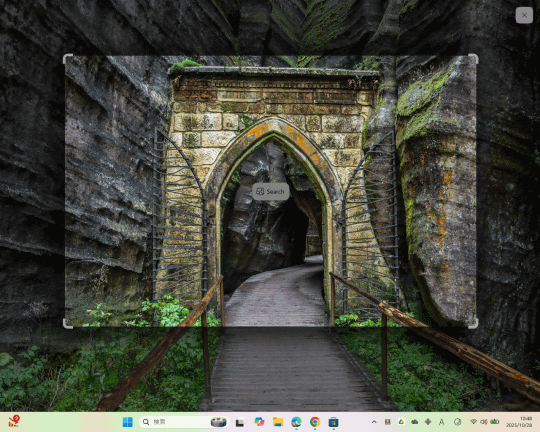 デスクトップ右上のアイコンをクリックすると、スクリーンを矩形選択して、その範囲を「Bing」の画像検索にかけられます。――もちろん 「Microsoft Edge」 で!