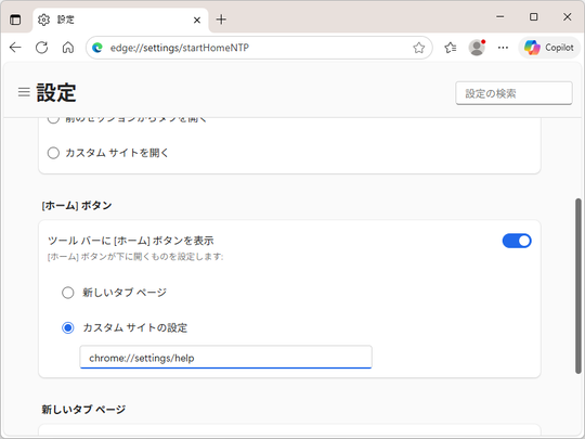 - 「Microsoft Edge」の場合:「edge://settings/startHomeNTP」を開いて、[ホーム]ボタンを有効化し、カスタムサイトを「edge://settings/help」にする
