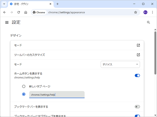 - 「Google Chrome」の場合:「chrome://settings/appearance」を開いて[ホーム]ボタンを有効化し、カスタムサイトを「chrome://settings/help」にする