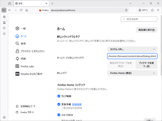 「Firefox」には「about://settings/help」に相当するページがないのですが、代わりに「chrome://browser/content/aboutDialog.xhtml」を指定しておけばよいのだとか。[ホーム]画面の設定は「about:preferences#home」で行えます。