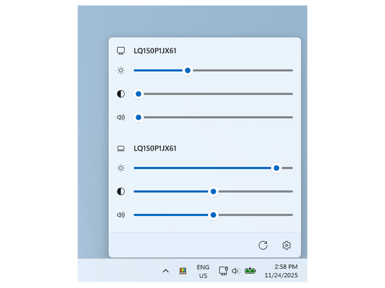 このツールはタスクトレイに常駐し、ディスプレイの輝度・コントラスト・音量をスライダーで調整できるようにするもののようです。マルチモニター環境にも対応するようで、チラ見せされたスクリーンショットには2つのモニターで異なる設定が可能であることが示されています(ディスプレイの名前が両方同じなのはバグとのことで、修正予定)。