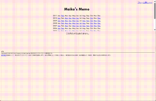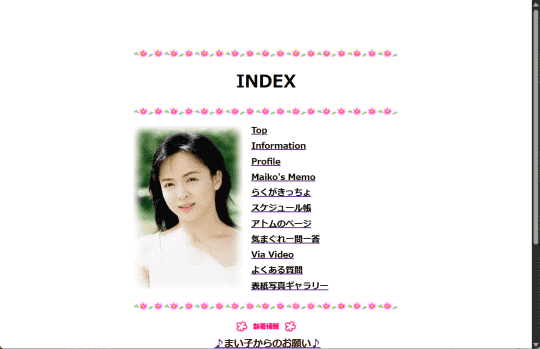 コンテンツはインフォメーションやプロフィール、愛犬アトムの紹介やスケジュールなど。インフォメーションページや「Maiko's Memo」ページの壁紙や各所に使われたフレームがインターネットが平和だったあの頃を思い出させてくれます。
