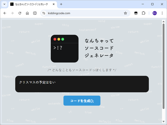 使い方は簡単で、50文字以内のテキストを入力して[コードを生成();]ボタンを押すだけ(もちろん日本語でOK)。試しに「クリスマスの予定はない」というテキストを入力してみましたが、以下のような応答が返ってきました。