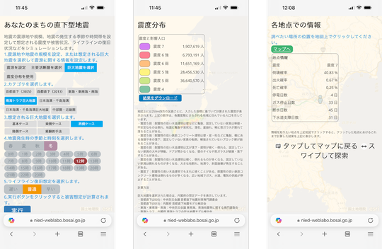 公益社団法人 日本地震工学会さんが防災科研の「あなたのまちの直下型地震」というWebサイトを紹介しています。地震の震源地や規模、発生する季節や時間帯を設定すると、想定される震度や被害状況、ライフラインの復旧状況などをシミュレーションすることができます。