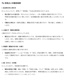 ちなみにこのAI占いですが、人相占いや姓名判断、誕生日占いもできたりします。勢いあまって「足の裏占い」もお願いしたらできたのですが、これはハルシネーションと呼ぶべきなのかどうか、悩むところ(笑