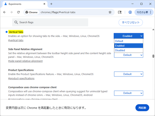 垂直タブはベータ版「Chrome」でも既定で無効化されているため、利用するには試験フラグ(Experiments)をONにする必要があります。アドレスバーに以下のURLを入力して試験フラグへアクセスし、設定を[Enabled]に切り替えて「Chrome」を再起動しましょう。