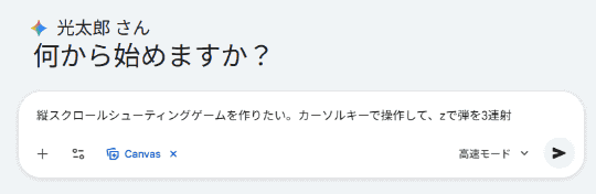 どれぐらい簡単かというと、Geminiを開き、 [ツール]の項から [Canvas]を選んだあと、「縦スクロールシューティングゲームを作りたい。カーソルキーで操作して、zで弾を3連射」などと入れるだけ。